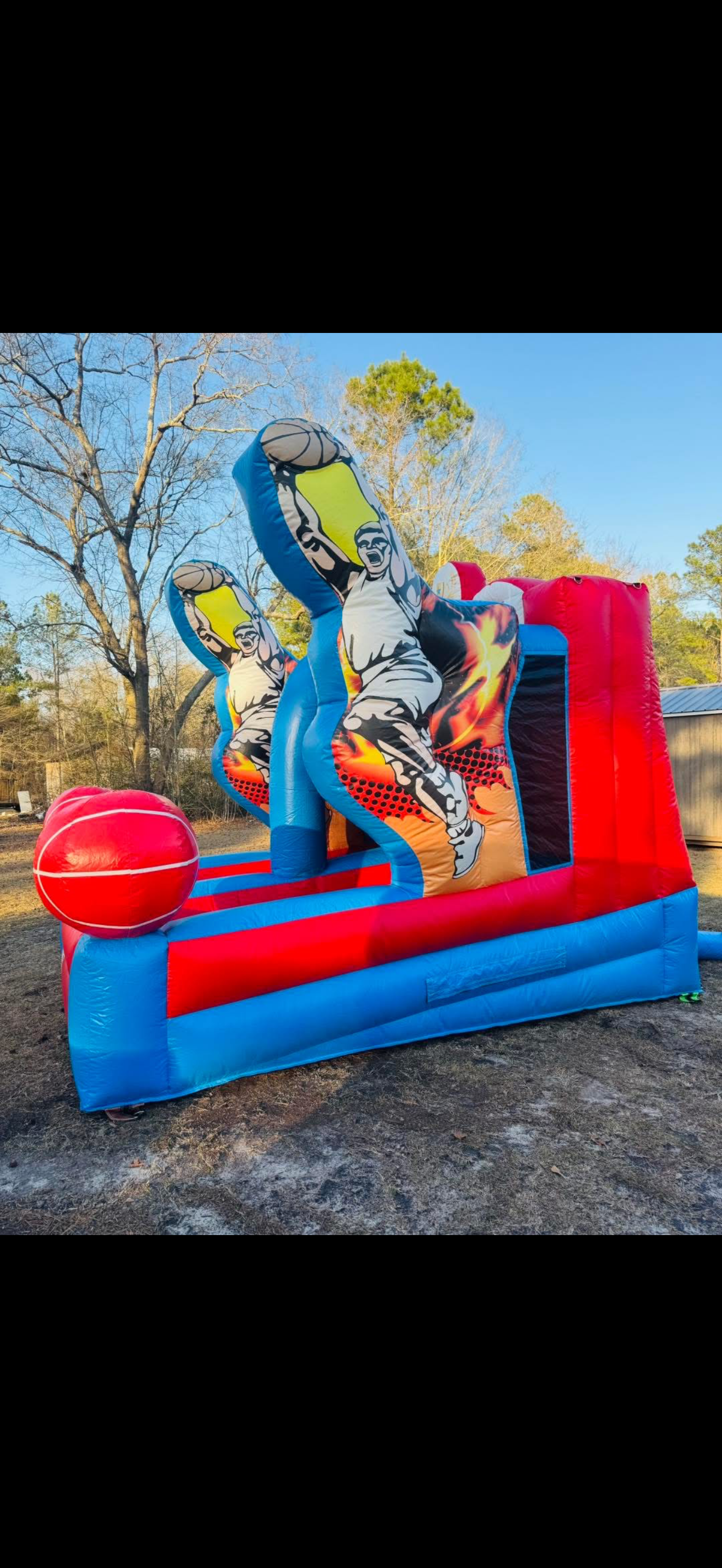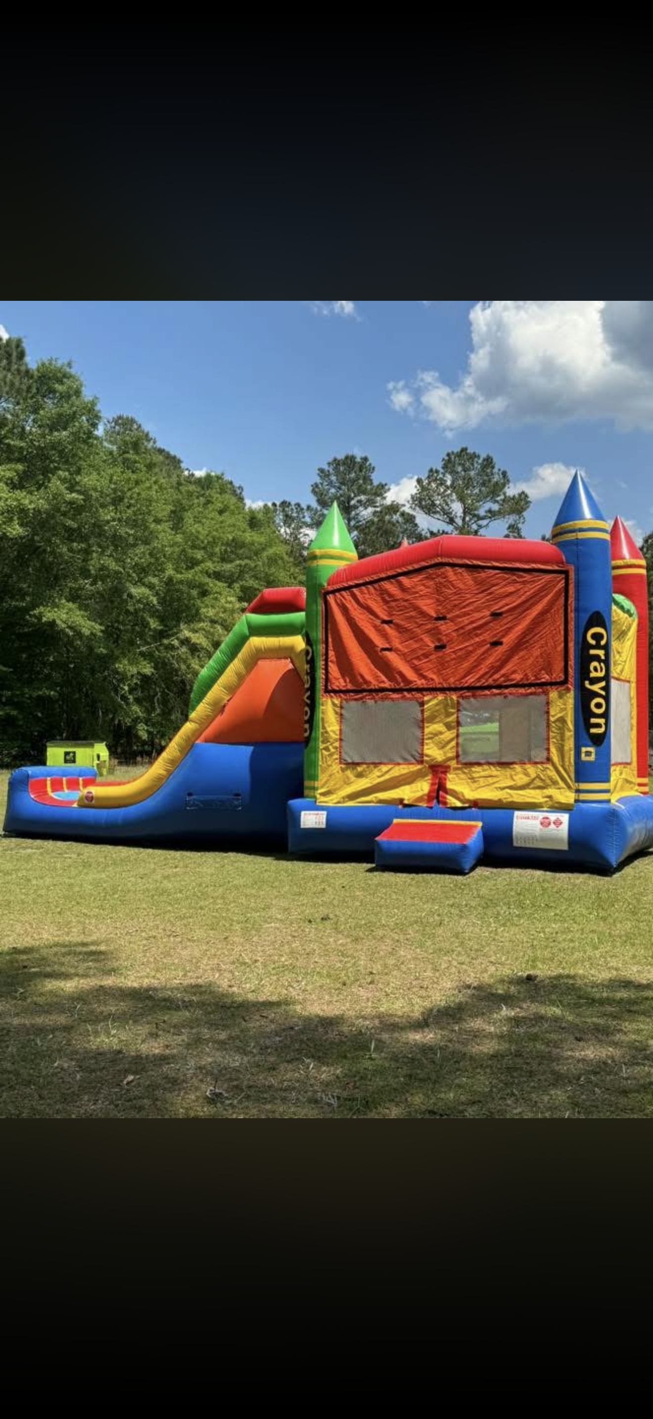 Our Crayola Combo is a large Bounce House with a 14 foot tall slide attached. This combo also includes a basketball goal inside and is dry-use only.