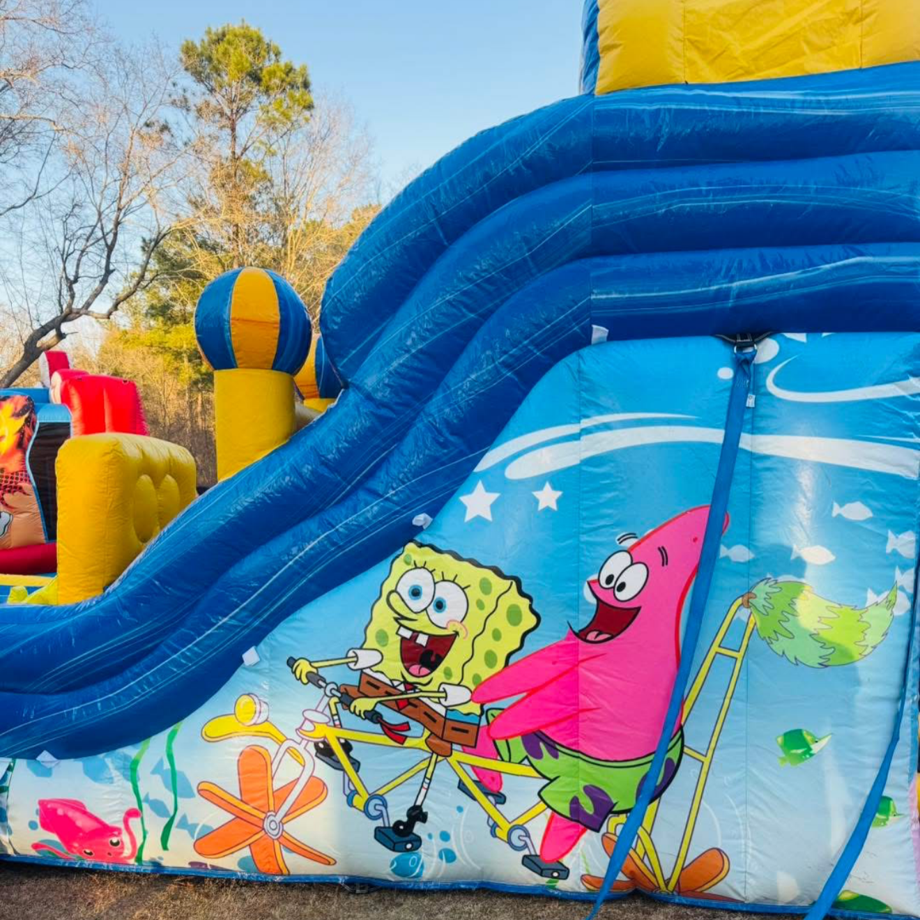 Our 14 Foot tall SpongeBob slide is a dual-lane slide that can be used dry or wet. Great for younger children. Everyone loves the fact that you enter the steps of the slide through SpongeBob’s Mouth.